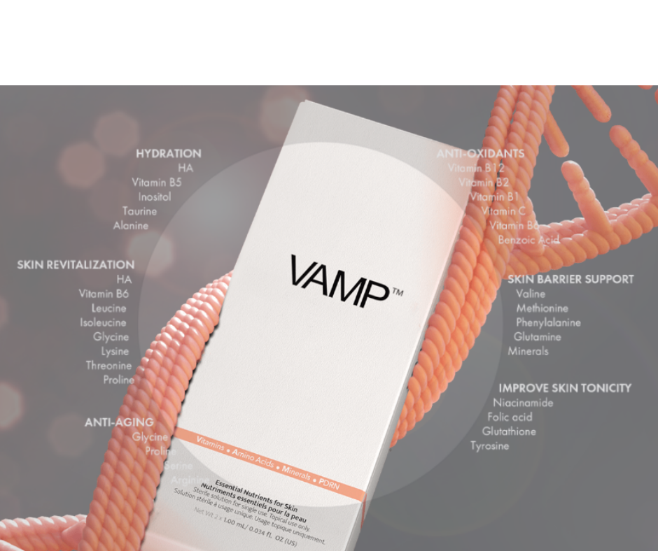 VAMP™ is a topical , sterile bio-revitalizing solution enriched with a powerful blend of Vitamins, Amino acids, Minerals and PDRN for skin rejuvenation and revitalization. It helps to improve skin tonicity, tighten pores and smooth wrinkles. Overall, restoring skin’s glow, hydration and improving skin texture.